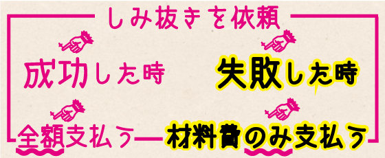 ざっくりとした説明ですが、お客様側は念願の汚れ落としが成功しないながらも費用負担は最小限度で済み、お店側は成功できなかった事で原材料費分と人件費分しかいただけず、お客様からの技術的な信頼を損なう危険度が高いというシステムです。